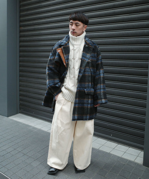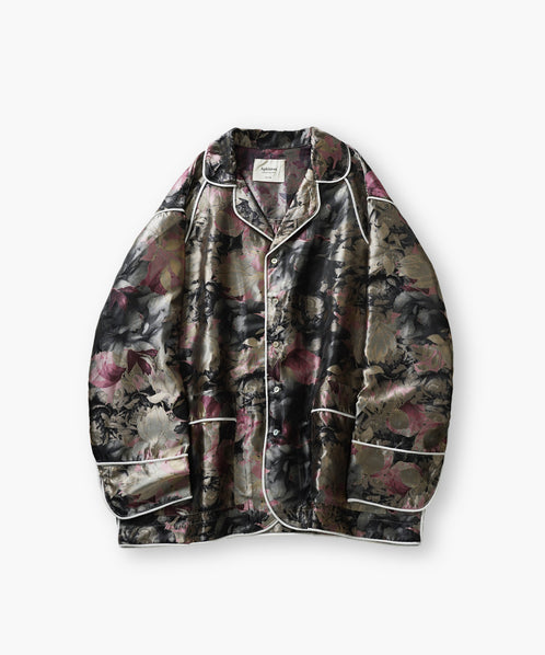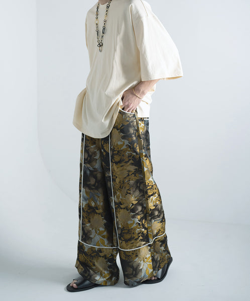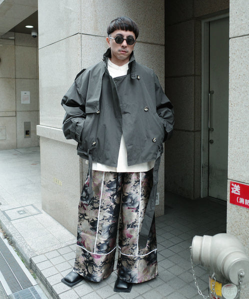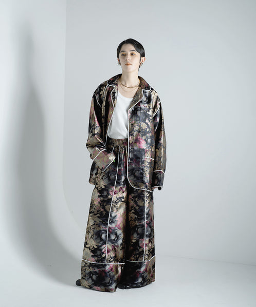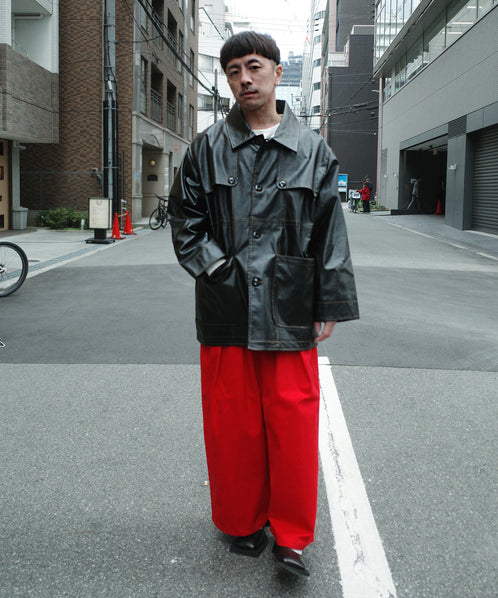 パジャマテイストのデザインは革小物でカチッとまとめるもよし、カットソーやサンダル等でラフに着崩すもよし。もちろん同デザインのシャツとセットアップでの着用もおすすめです。