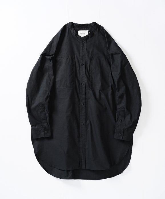 定番のロングシャツをオールブラックでシンプルにまとめたコーデ。