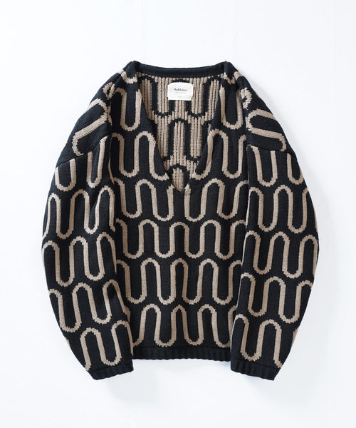 深めに開いたVネックとオリジナルのパターングラフィックが他と被らないニット。