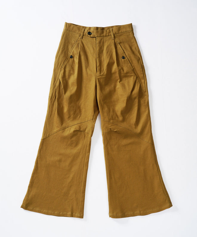 Aphlotusでは珍しいベルボトムのシルエットだが、ポケット下に施されたタックや膝位置のダーツが