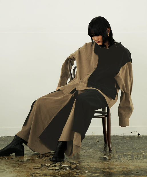 定番アイテムのトレンチコートもAphlotusらしいオーバーシルエットで。