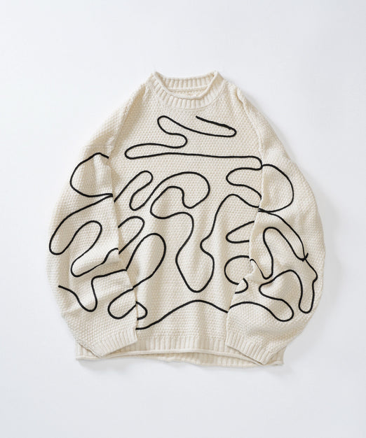 オリジナルのライン刺繍生地がコーデの主役にも名脇役にもなるニット。