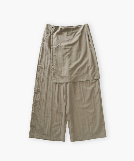 ポリエステルとナイロンの混紡素材を使用した、レイヤードデザインのボトムス。
