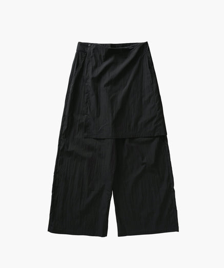 ポリエステルとナイロンの混紡素材を使用した、レイヤードデザインのボトムス。
