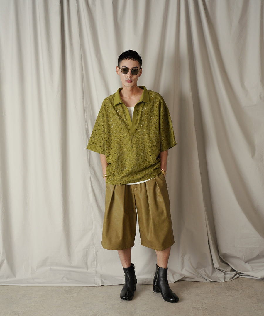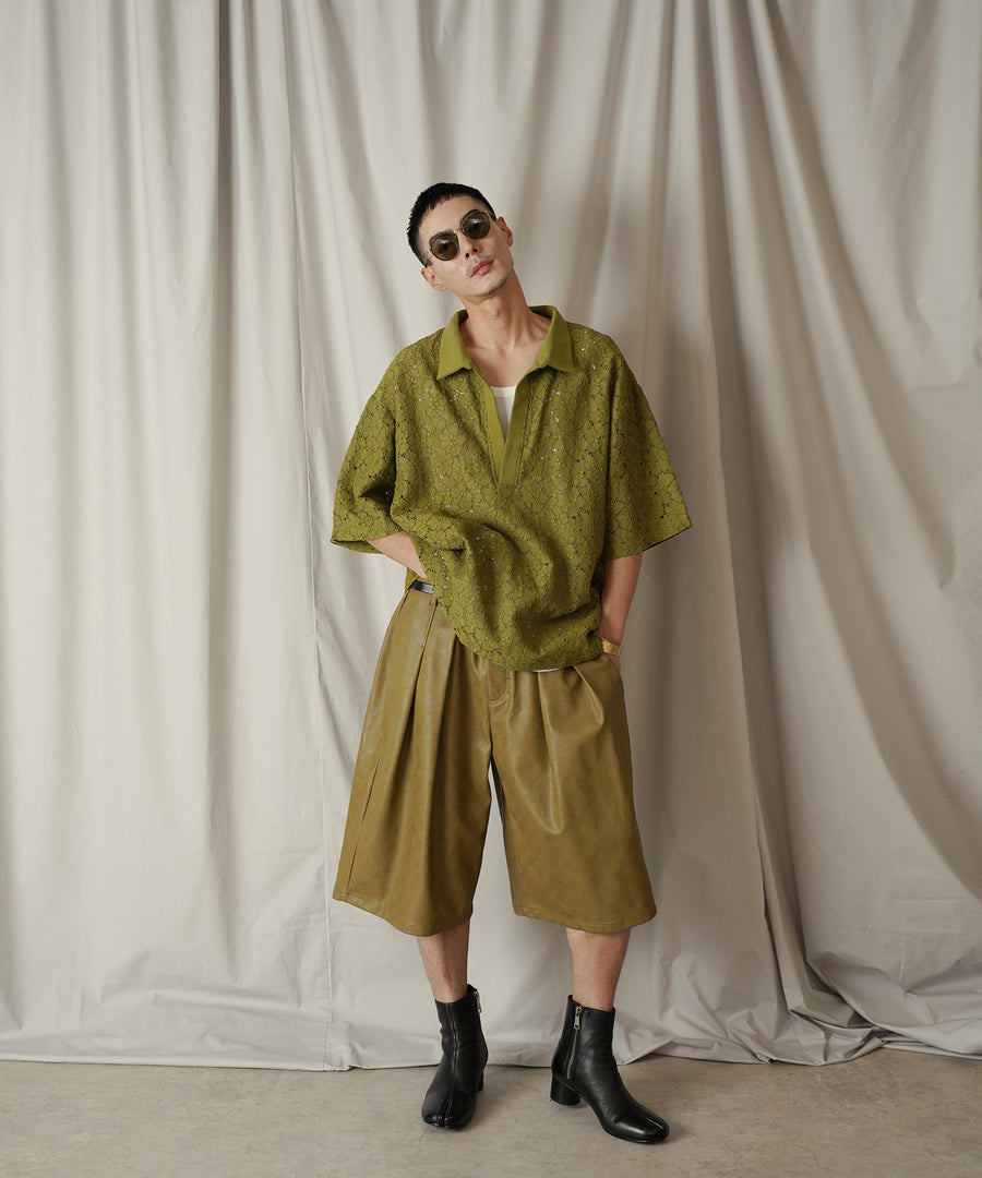 【 Aphlotus / アプロタス 】 2025 Summer Collection Product No.217612 バギーフレア ハーフパンツ Baggy Flare Shorts Aphlotus定番のフルレングスの バギーパンツにSSならではの改良を施した ハーフパンツ。 感度の高くトレンドのエスニック柄の ゴブラン生地と 着古したかのような擦れ感と張り感のある フェイクレザーを使用。 フェイクレザーのブラックとオリーブは 定番カラーとして幅広いアイテムと コーディネート可能。 エスニック柄のゴブラン素材はシンプルな トップスと合わせて頂くことでメリハリの あるコーディネートをお楽しみ頂けます。 膝下丈のパンツは子供っぽくならず、 スニーカーやドレスシューズ/サンダルとも 相性抜群となっております。 コーディネートに一癖加えつつ、 垢抜けたシティスタイルを演出。 ウエストを見返し始末にしている為 タックインしても他とは違う雰囲気を演出。 細身の革ベルトはもちろんサスペンダーとも 相性抜群となっており、前のタックは 途中まで中縫いされており、 ウエストはスッキリした印象を保ちつつフ レア気味のシルエットは他にはない一着。...