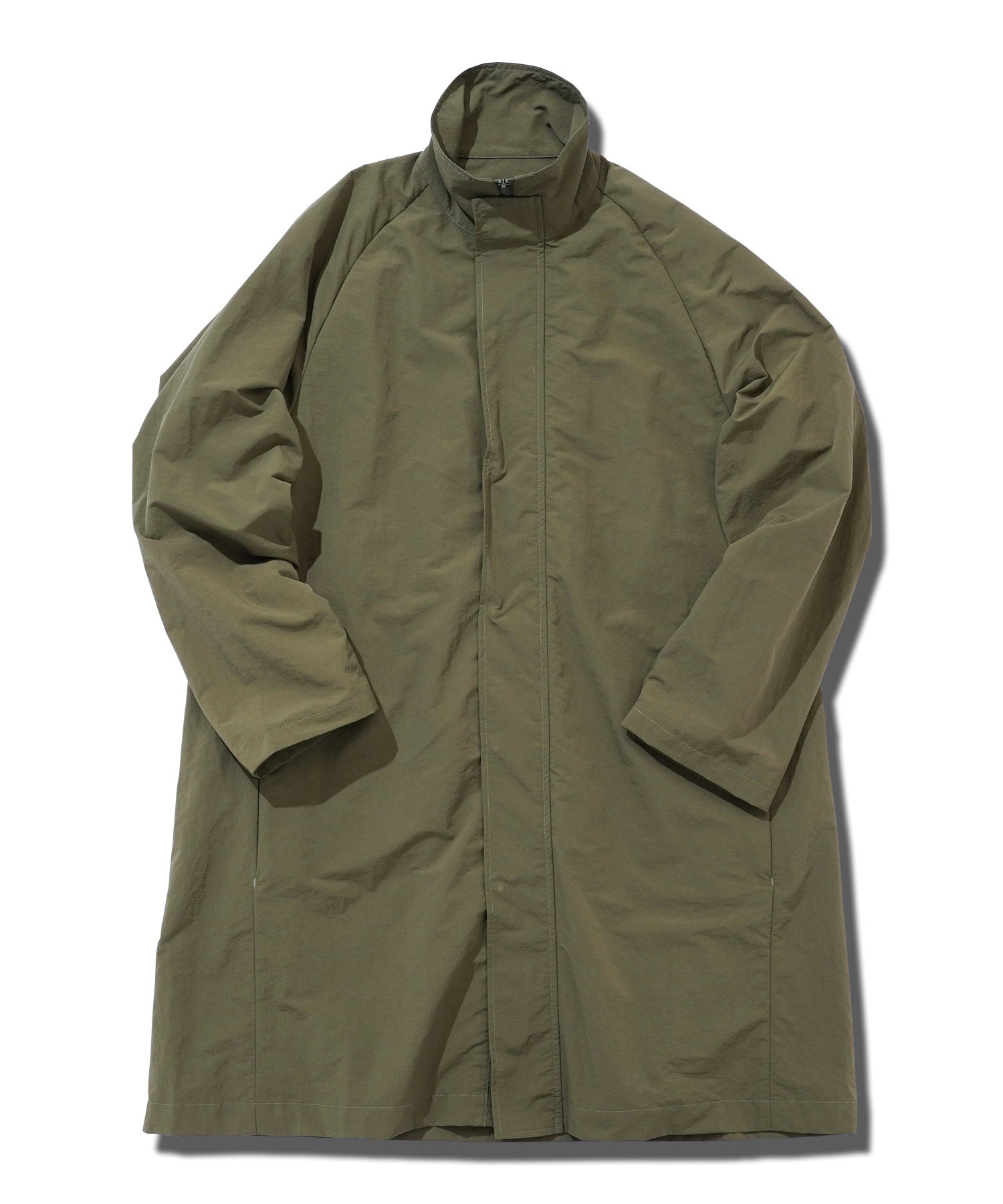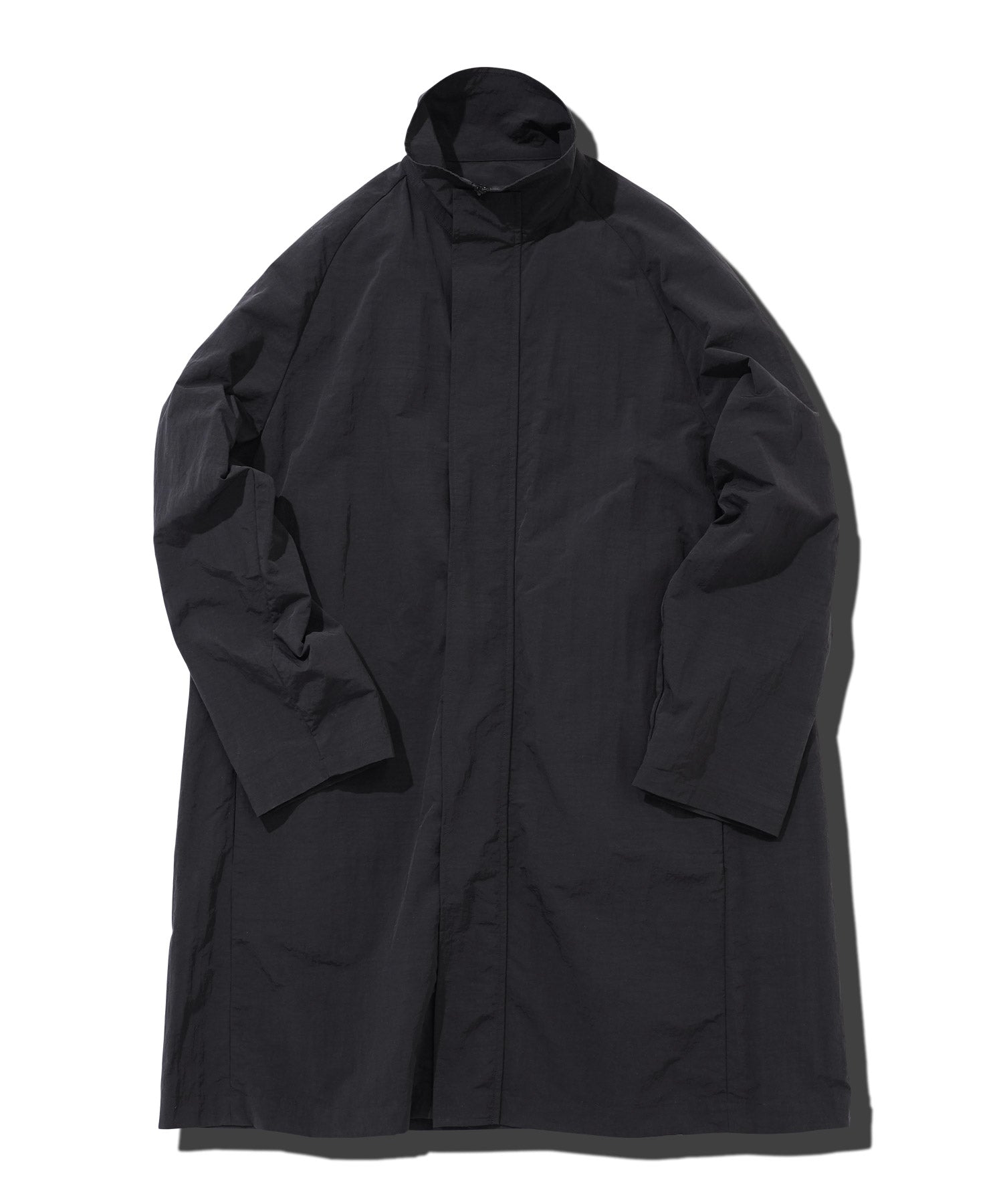 ナイロン100%の撥水性を持つマットな生地を使用し、薄いシワ感が特徴的。軽量でありながらしっかりとしたハリ感を持ち、身体のラインを拾いにくい特性があります。シンプルでありながら洗練されたデザインを持つこのコートは、機能性とファッション性を両立。また、撥水加工により悪天候にも対応可能で、日常的な使用はもちろん、旅行やアウトドアシーンでも活躍。