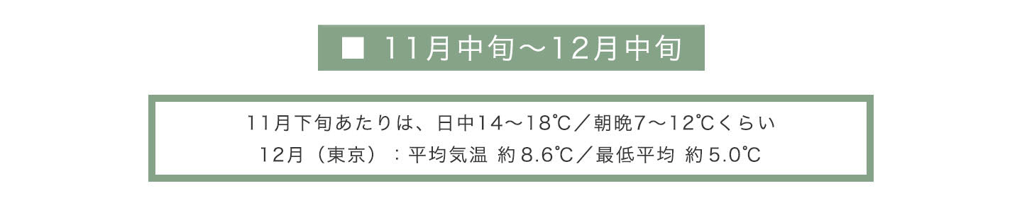この時期は「日中でも10〜15℃前後/朝晩5〜10℃前後」と、冷え込みがはっきりしてきます。この時期におすすめなのは中厚〜やや厚めのニットを選ぶと安心です。ウール混・アルパカ混などの暖か素材を意識するのが◎。